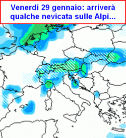 La prima cartina ci mostra uno di questi piccoli "attacchi" allo strapotere anticiclonico, mosso da una debole perturbazione che venerdì 29 gennaio si appoggerà sul nord Italia.