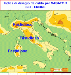 La prima mappa ci mostra l’indice di disagio da caldo atteso in Italia nella giornata di sabato 3 settembre. Come si può notare, la pianura padana, il versante tirrenico e la Sardegna si troveranno avvolte da condizioni di caldo disagevole, stante la combinazione tra l’umidità e alte temperature.