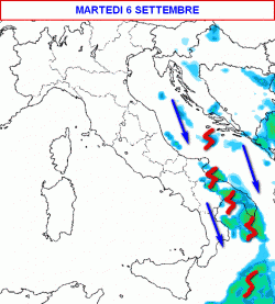 Un piccolo cambiamento potrebbe intervenire tra martedì 6 e mercoledì 7 settembre: l’alta  pressione si porterà leggermente più ad ovest, dando adito a correnti più fresche settentrionali di interessare il basso versante adriatico e parte del meridione (seconda mappa) con alcuni temporali in transito da nord a sud. Nessun cambiamento sulle altre regioni che seguiteranno ad avere tempo stabile, soleggiato e caldo.