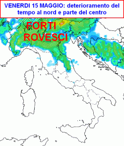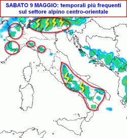 Sabato 9 maggio possibili temporali sull’arco alpino centro-orientale, zone pianeggianti limitrofe, qualche fenomeno anche nelle zone interne del centro-sud nel pomeriggio, per il resto abbastanza soleggiato e più fresco. Ventilazione da nord-ovest fino a moderata. Domenica 10 maggio qualche temporale al sud, specie tra Puglia, Basilicata, Calabria e Sicilia orientale, con ventilazione da nord e calo termico, per il resto bel tempo e clima gradevole. Da lunedì 11 fino a giovedì 14 maggio bel tempo ovunque e progressivo aumento delle temperature, qualche addensamento lunedì al sud e giovedì al nord. Venerdì 15 maggio maltempo al nord e nelle zone interne del centro, più sole altrove, calano le temperature al settentrione.