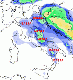 Il quadro delle probabilità di piogge superiori a 5 mm, calcolate in base a tutti i run alternativi del modello americano per martedi 26 marzo sentenzia un maggiore interessamento del versante adriatico e del meridione.