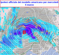 Un succulento carico di pioggia (e di neve sulle Alpi e l’Appennino centro-settentrionale) viene contemplato quest’oggi dalla corsa ufficiale del modello americano valida per mercoledi 6 marzo (seconda mappa).