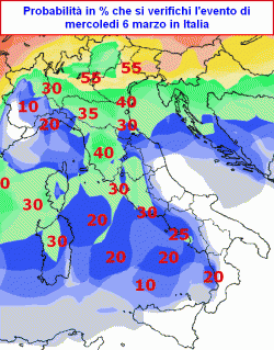 Solo il settore di nord-est e forse l’arco alpino denunciano una probabilità superiore o uguale al 50%. Le restanti zone d’Italia (segnatamente il nord-ovest, la Sardegna e il Tirreno) presentano una probabilità di evento bassa, tra il 20 e il 40% a seconda delle zone.