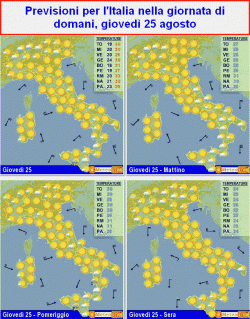 Esaurite le ultime manifestazioni d'instabilità attese ancora per oggi, mercoledì 24 agosto, sulle nostre regioni meridionali, l'influenza stabile e calda portata dall'alta pressione riuscirà ad estendersi a tutto il nostro Paese. Un cambiamento forse con l'inizio della settimana prossima (lunedì 29 - martedì 30).