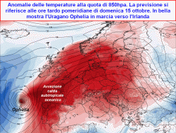 Proprio in occasione del fine settimana ormai imminente, il bacino centrale del Mediterraneo ed una grossa fetta d’Europa, faranno i conti con un potente anticiclone ricolmo d’aria calda a tutte le quote. Tale figura altopressoria trarrà linfa vitale da una anomala alimentazione d’aria calda proveniente direttamente dalle latitudini subtropicali dell’oceano Atlantico, laddove ritroveremo in azione anche un Uragano di categoria 1, "Ophelia", previsto impattare lunedì 16 ottobre sulle coste occidentali dell’Irlanda.