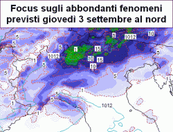 giovedì 3 settembre: al nord maltempo temporalesco in trasferimento da ovest ad est, parziale coinvolgimento dell’alta Toscana con fenomeni anche intensi. Sul resto del centro nuvolaglia sparsa con ampie schiarite e primi temporali dalla sera a partire dal Mar Tirreno, asciutto sulla Sardegna. Al sud ancora bel tempo, temperature in netto calo al nord, in lieve calo al centro, ancora caldo al meridione.