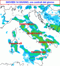 Giovedì 14 giugno: tempo molto instabile al centro, al sud ed in misura minore al nord con rischio di temporali sparsi e calo delle temperature. Più sole al nord anche se in un contesto molto variabile.