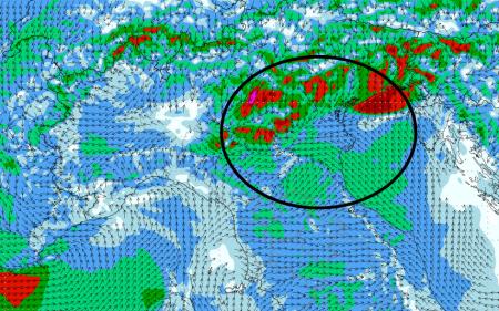 Uno di questi corpi nuvolosi attraverserà parte delle regioni settentrionali tra il pomeriggio e la serata di domani, sabato 11 giugno, con qualche fenomeno temporalesco di forte intensità previsto per le regioni Veneto ed Emilia Romagna nel tardo pomeriggio e nella serata di domani. Ecco una stima dei venti al suolo previsti dal modello lamma per domani pomeriggio, nella quale osserviamo una vistosa convergenza tra venti di Scirocco, Bora e sud-ovest secco, foriera di forti temporali: