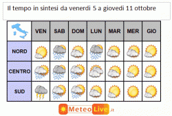 domenica 7 ottobre: schiarite al nord in mattinata, poi nubi in aumento al nord-ovest con locali temporali o rovesci di pioggia, al centro e al sud nubi sparse con rovesci sparsi e qualche residuo temporale, tendenza a miglioramento.