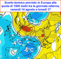 Degna di nota sarà anche la riduzione della temperatura che per un breve periodo, potrebbe addirittura portarsi INFERIORE alle medie stagionali. Questa notizia acquista ancor più rilevanza se consideriamo che l’estate 2015 è stata sinora scandita dai picchi di calore portati dall’anticiclone africano che si è manifestato nel pieno della sua forma. Ad ogni modo, l’apice di questo raffreddamento dovrebbe verificarsi tra domenica 16 e lunedì 17 e risulterebbe più sensibile sulle regioni centro-settentrionali del Paese. Farebbe quasi "freddo" sulle cime alte dell’Appennino e lungo le Alpi, molto fresco nottetempo ed al primo mattino sulle pianure e le valli interne. La riduzione della temperatura si farà comunque sentire anche sul resto del Paese, mitigato soltanto nelle regioni costiere dal mare ancora molto caldo.