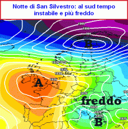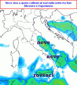 martedì 1° gennaio: al mattino ancora nuvoloso al sud e sull’Abruzzo con brevi nevicate in Appennino sino a 400m, rovesci di pioggia in pianura, vento e freddo, poi migliora in giornata, bello altrove, un po’ freddo al mattino.