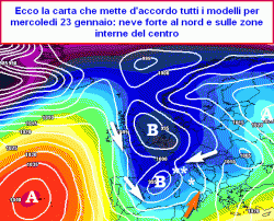 Sarà questo pacchetto di aria fredda a preparare probabilmente il terreno alle nevicate che potranno manifestarsi nel corso della giornata di mercoledì 23 sulle nostre regioni settentrionali e sulle zone interne del centro a quote molto basse.