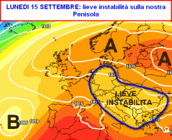 Quando ne usciremo? Nel week-end e nei primi giorni della settimana prossima assisteremo ad un certo miglioramento, ma come vedete dalla seconda cartina (valida per le ore centrali di lunedi 15 settembre) nessuna figura altopressoria ci interesserà direttamente.