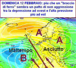In altre parole, la depressione resterà sul posto e confinerà i fenomeni più intensi ad ovest della linea rossa visibile sulla prima mappa; di conseguenza fino alla giornata di lunedì 13 febbraio la situazione meteo non cambierà sull’Italia e sarà caratterizzata da un’estrema variabilità con poche precipitazioni. Il contesto termici sarà abbastanza mite stante le correnti di matrice meridionale.