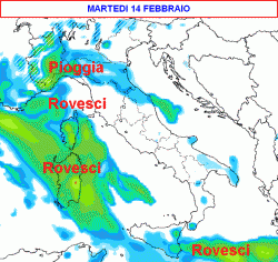 Tra martedì 14 e mercoledì 15 febbraio: rovesci anche intensi sulla Sardegna, piogge al nord-ovest con neve sulle Alpi, piovaschi su Sicilia, Marche ed Emilia Romagna, per il resto asciutto e in larga parte soleggiato.