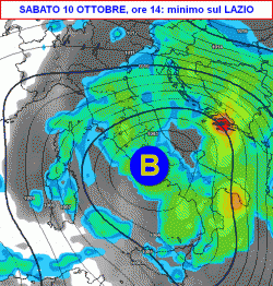 La prima cartina, valida per le ore 14 della giornata in parola, ci mostra una ragnatela di isobare che si avvitano attorno ad un minimo barico piuttosto profondo posizionato grossomodo sul Lazio.