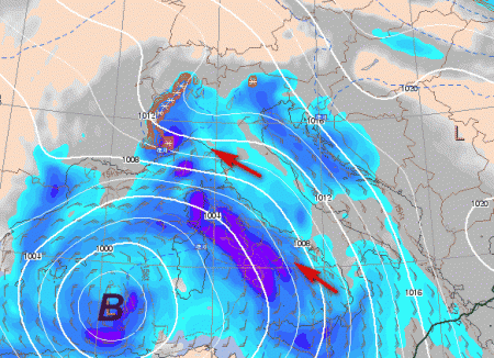 Ecco il quadro sinottico e precipitativo previsto dal modello americano nella notte tra venerdì 27 e sabato 28, si nota la forte sciroccata su tutti i nostri bacini: