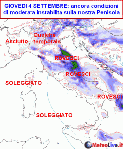 Giovedi 4 e venerdì 5 settembre: la depressione allargherà le maglie e interesserà con condizioni localmente instabili il versante adriatico e i rilievi in genere. Più sole altrove anche se nel pomeriggio qualche temporale sarà possibile. Vento in attenuazione e temperature in lento aumento anche al sud.