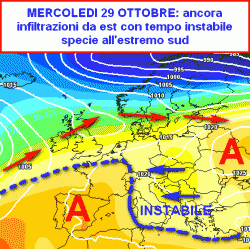 La prima cartina che abbiamo preparato inquadra la situazione sinottica al suolo valida per le ore centrali della giornata di mercoledì 29 ottobre. Come si può notare, la parte più forte dell’alta pressione sarà ubicata in sede iberica, mentre la nostra Penisola sarà ancora sotto il tiro dei freschi venti da est.