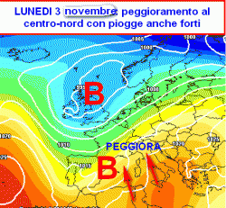 Il guasto vero e proprio diverrà però realtà al centro-nord nella giornata di lunedì 3 novembre. Come si nota dalla terza cartina, una vasta saccatura farà il suo ingresso sul Mediterraneo occidentale con il suo carico di pioggia. Le prime regioni ad essere interessate saranno quelle settentrionali e del versante tirrenico.