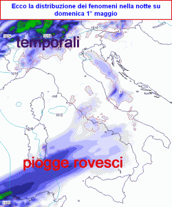 Domenica 1° Maggio la depressione andrà a collocarsi all’altezza del medio Tirreno, interessando un po’ tutta la Penisola, ma soprattutto Lombardia, Triveneto, Emilia-Romagna e quasi tutto il centro-sud peninsulare con piogge abbondanti e fenomeni temporaleschi anche grandinigeni.