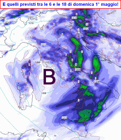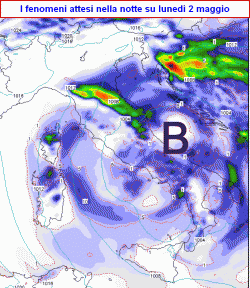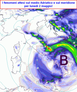Nella notte su lunedi 2 maggio il vortice andrà a posizionarsi tra Molise e Gargano ed il maltempo si concentrerà al centro-sud, liberando il nord e risultando più intenso in Adriatico e sul meridione.