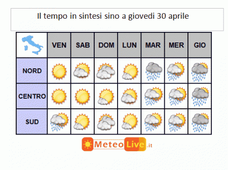 Ecco la previsione testuale in SINTESI sino a giovedì 30 aprile: