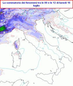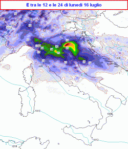 lunedì 16 luglio: al nord molto instabile con piogge e rovesci temporaleschi, al centro graduale peggioramento con rovesci anche intensi tra Toscana, interna, Umbria, nord Marche, più sparsi altrove, verso sera migliora al nord-ovest, fenomeni in localizzazione sul medio Adriatico; al sud dapprima parzialmente soleggiato, poi nuvoloso sul Molise e il Foggiano con possibili rovesci, ancora in parte soleggiato ed asciutto altrove. Temperature in generale flessione.