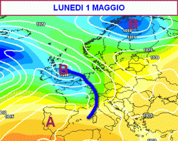 In bella mostra nella prima mappa, la perturbazione che guasterà la festa del Primo Maggio sulle regioni settentrionali e parte del centro (segnatamente la Toscana e le zone interne appenniniche).