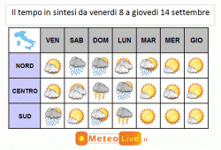 venerdì 8 settembre: temporali sparsi possibili al sud, specie su Sicilia, Calabria, Lucania e Puglia nel corso della giornata, al mattino residui rovesci su Romagna, nubi basse al nord-ovest indotte dai venti da est, in attenuazione con il passare delle ore, per il resto tempo buono.