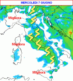 Mercoledì 7 giugno (terza mappa), il grosso del maltempo inizierà a traslare verso levante. Sul settore di nord-ovest e in Toscana la situazione tenderà a migliorare; resterà invece molto instabile sul nord-est e al centro-sud, dove i temporali potrebbero risultare anche intensi, specie sul Tirreno e le zone interne peninsulari.