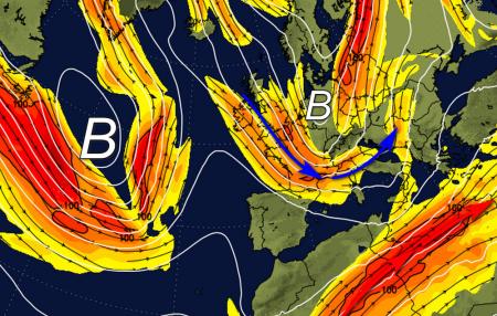 Ancora notizie negative per chi si aspettava un esordio di maggio sotto condizioni atmosferiche più tranquille. Appena pochi giorni fa, i modelli ci avevano regalato l’illusione che una pausa anticiclonica più duratura, potesse effettivamente verificarsi ma a quanto pare siamo ancora distanti da questo traguardo. Le fasce anticicloniche subtropicali rimangono ancora assai basse di latitudine e questo può essere osservato dalla presenza di una attiva corrente a getto subtropicale che al momento risulta collocata sul continente nord-africano, lontano dalle coste europee. La previsione sulla corrente a getto calcolata dal modello europeo per sabato 4 maggio, disegna il passaggio della Jet Stream subtropicale nel cuore del continente africano, lo vediamo spuntare in basso a destra nella cartina, mentre sull’Europa è previsto l’arrivo di un ramo della corrente a getto polare: