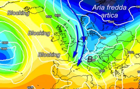 Tra domenica e lunedì appare probabile lo sviluppo di una depressione cosiddetta "da contrasto", con effetti previsti sul tempo delle regioni adriatiche, laddove potrebbero verificarsi precipitazioni con neve a bassa quota. Dalla serata di domenica è previsto un brusco abbassamento delle temperature su tutto il Paese, entro lunedì mattina i valori potrebbero risultare inferiori alle media anche più di 10°C soprattutto al nord. Ecco l’analisi sinottica del modello americano riferita alle ore serali di domenica, importante saccatura artica raggiunge il Mediterraneo: