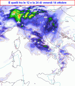 venerdì 14 ottobre: maltempo su nord e centro con piogge e temporali, neve sulle Alpi solo oltre i 1500m, in ulteriore rialzo. Al sud giornata parzialmente nuvoloso e calda, specie in Sicilia. Temperature in generale rialzo ovunque, non solo al meridione.