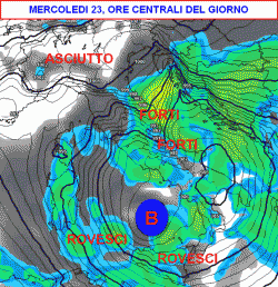 Il nord e la Toscana non avranno praticamente fenomeni degni di nota, se si eccettua qualche precipitazione isolata e senza troppe "pretese". Gli effetti più pesanti di questa depressione si avvertiranno al meridione tramite di forti venti, mareggiate e rovesci di pioggia. I massimi quantitativi di pioggia si registreranno invece sul medio Adriatico (Marche, Umbria orientale e Abruzzo) dove l’impatto delle correnti da est umide sui contrafforti dell’Appennino potrebbe originare localmente accumuli superiori a 100mm. Abbondanti nevicate cadranno sull’Appennino marchigiano e Abruzzese sopra gli 800-1000 metri.