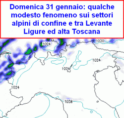 domenica 31: un po’ di nubi al nord e sulla Toscana, spruzzate di neve ad alta quota sulle zone alpine di confine dall’alta Valle d’Aosta all’Alto Adige, più a sud schiarite e tendenza al favonio nelle valli in serata con clima mite, bel tempo altrove, salvo velature in transito.