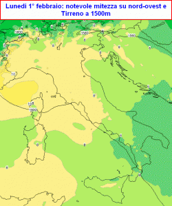 Da rilevare invece l’aria molto mite che si inserirà lunedi 1° febbraio su nord-ovest e Tirreno con foehn caldo atteso alle sbocco delle vallate alpine centro-occidentali, un’altra nota fortemente negativa.