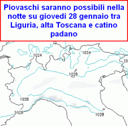 venerdì 29: nelle prime ore transito del fronte a ridosso delle Alpi con isolate e deboli precipitazioni, nevose oltre i 1500m, tendenza a miglioramento nel corso della giornata, velature o nubi basse sul resto del nord in graduale dissolvimento, nuvolaglia anche sulla Toscana in dissoluzione, passaggi nuvolosi innocui sul resto del centro, bello e mite al sud.