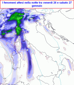 venerdì 26 gennaio: al nord-ovest molto nuvoloso con piogge e rovesci sino all’estremo ovest della Lombardia, ma in estensione a tutta la regione e Piacentino, limite della neve oltre i 700-1100m. Al nord-est nuvoloso nelle Alpi con deboli precipitazioni nevose oltre gli 800-1300m, irregolarmente nuvoloso in pianura e sull’Emilia-Romagna con basso rischio di pioggia. Nuvoloso sulla Toscana, Umbria, Lazio e Sardegna con locali piogge, velato o parzialmente nuvoloso altrove.