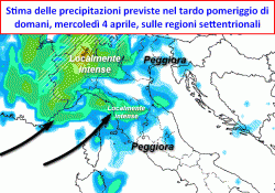 Già in queste ore una nuova perturbazione interessa le nostre regioni settentrionali, laddove troviamo delle precipitazioni concentrate soprattutto nell’angolo nord-occidentale. La parte più attiva del corpo nuvoloso è però prevista tra questa sera e la giornata di domani, mercoledì 4 aprile, momento in cui il nostro Paese verrà attraversato dal ramo più attivo del corpo nuvoloso che colpirà il nord ed il centro Italia, associato ad un calo delle temperature dovuto al contributo d’aria fredda in arrivo in quota, poi scaricato al suolo per mezzo delle precipitazioni.