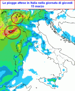 Come anticipato poco sopra, la tregua sarà di breve durata. Nella giornata di giovedì 15 marzo (seconda mappa) una nuova ed intensa perturbazione inizierà a dare effetti sul nord-ovest specie dal pomeriggio con piogge anche molto intense sul Ponente Ligure.