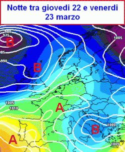 Venerdì 23 marzo: ancora piogge al sud con neve sui 600 metri, ma in attenuazione, per il resto tempo nel complesso buono, lieve aumento delle temperature massime ed attenuazione del vento.