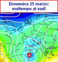 Domenica 25 e lunedi 26 marzo: maltempo al sud, sulla Sicilia e il medio-basso Adriatico con piogge più intense sulle regioni estreme, altrove belle schiarite e assenza di fenomeni, un po’ freddo al nord, mite al centro e al sud. Ventoso.