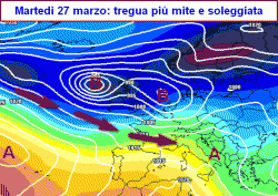 Martedi 27 e mercoledi 28 marzo: correnti più miti da ovest imporranno una certa variabilità al centro e al nord con qualche pioggia, bello al sud, clima molto mite ovunque.