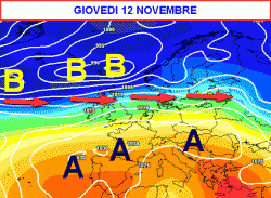 La seconda cartina previsionale valida per giovedì 12 novembre ci mostra un’alta pressione decisamente più vulnerabile e potenzialmente attaccabile sia dalle correnti fredde settentrionali che dai miti e piovosi venti oceanici.