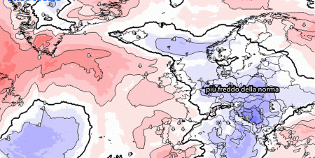 Di seguito una mappa che ci mostra l’anomalia termica a 1500 metri per lunedì 11. Fino a 5-6°C sotto le medie al sud.