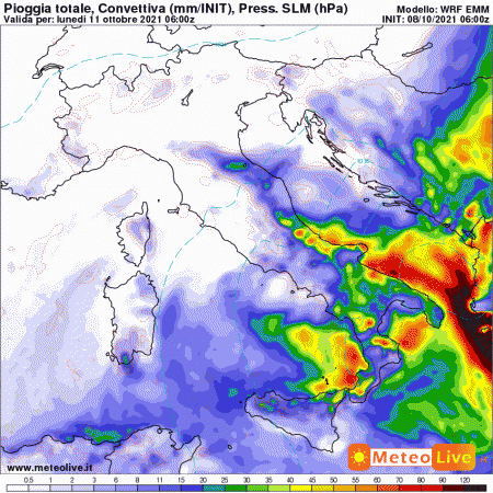 Sabato 9 ottobre: clima pienamente autunnale sul versante adriatico centro-meridionale e al sud. Piogge forti in Puglia, Calabria e Sicilia. Fenomeni residui su Molise e Abruzzo. Più soleggiato su Lazio, Toscana e al nord.Temperature in ulteriore lieve calo sul centro-sud, stazionarie al nord.