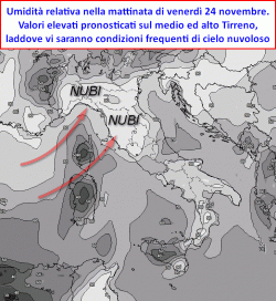 Venerdì 24: nuvolosità persistente lungo il medio ed alto Tirreno, qualche pioviggine su Liguria e Toscana. Altrove addensamenti di passaggio, molto mite.