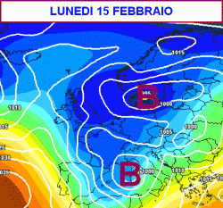 Un peggioramento marcato del tempo è atteso invece per l’inizio della settimana prossima. Le proiezioni modellistiche per lunedì 15 febbraio individuano una profonda depressione sull’Italia, con piogge anche intense e tanta neve su Alpi e Appennino centro-settentrionale (seconda figura a lato)