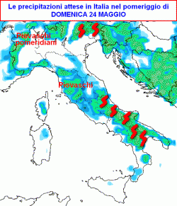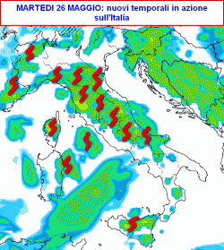La seconda cartina a lato ci mostra a grandi linee quale potrebbe essere la distribuzione delle precipitazioni e dei temporali nel pomeriggio di martedì 26 maggio. Come potete vedere, saranno molte le regioni che rischieranno una nuova innaffiata ad opera di piogge o temporali più o meno intensi.